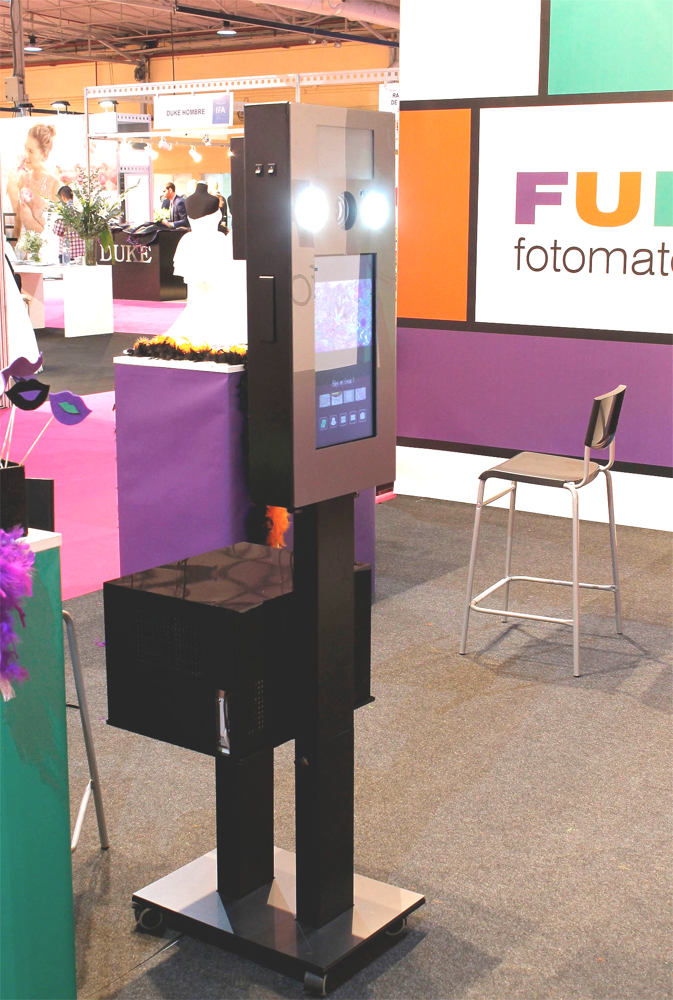 In this equipment, with minimal measurements, modern vertical screen design is combined with powerful software. This small and thin photo booth, with pure lines, and front finish in methacrylate silver / black / colour, has an impeccable presence in all the environments where it works.